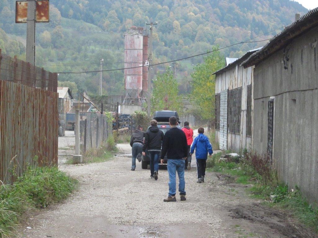 După o oră de grevă, mașina pornește împinsă de băieți. Deci putem porni la drum!