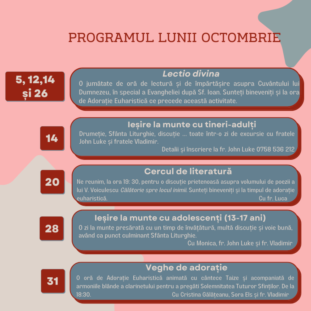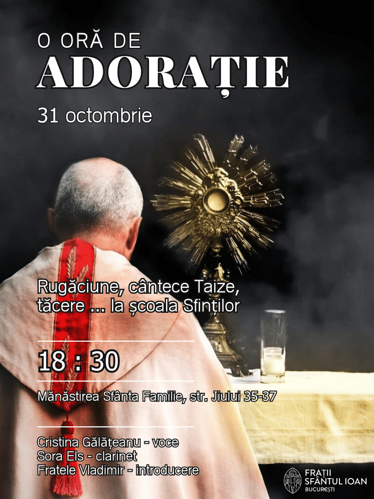 - la ora 18 : 00 vă așteptăm pentru a debuta acest timp binecuvântat cu rugăciunea Vesperelor, urmată de o oră de Adorație Euharistică în tăcere.