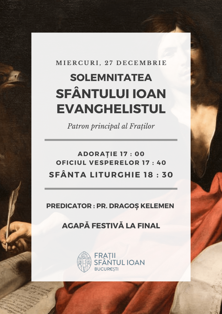 27 decembrie : Sărbătorim una din cele două solemnități principale ale Congregației noastre, Sfântul Ioan Evanghelistul. Vom celebra o liturghie solemnă (ora rămâne de confirmat) după care ne întâlnim pentru o agapă, un moment convivial în jurul unui pahar și a unui aperitiv. Anul acesta, avem bucuria de a-l avea printre noi pe Părintele franciscan Dragoș Kelemen care va predica pentru noi.