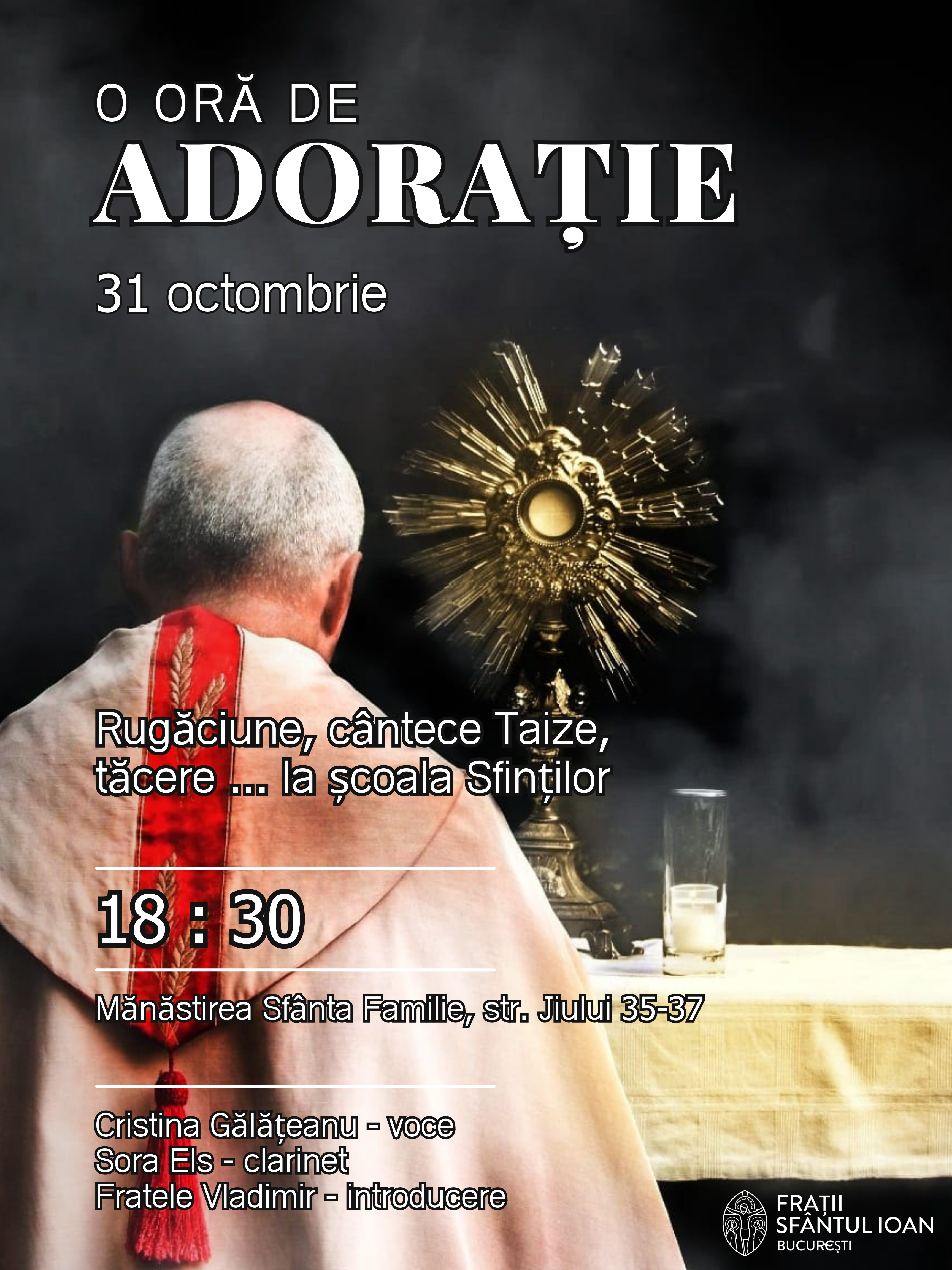 - la ora 18 : 00 Ne vom ruga Vesperele, urmate de o oră de Adorație Euharistică