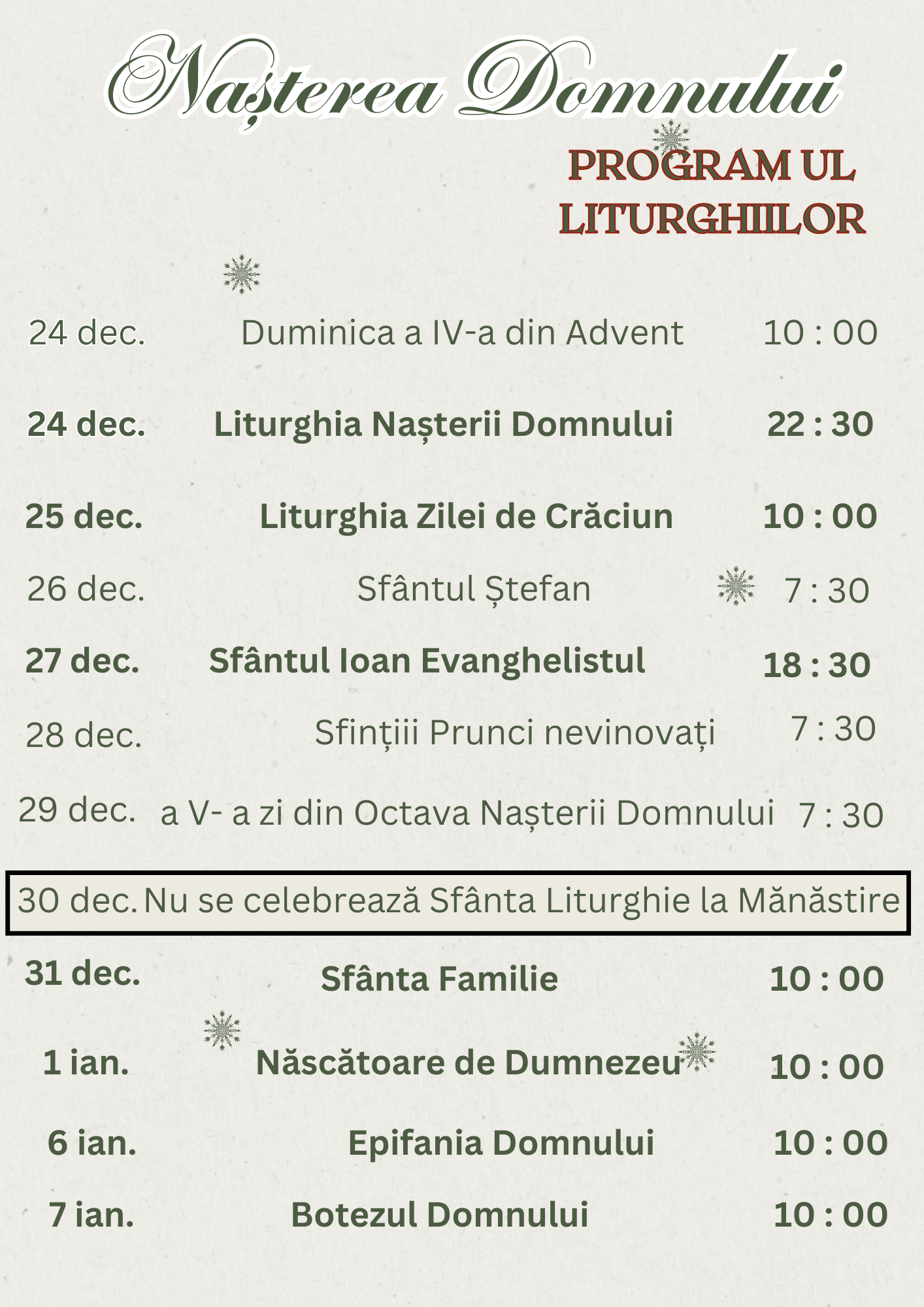 Poate una din cele mai frumoase luni ale anului, luna decembrie, iată și programul activităților la Mănăstire :